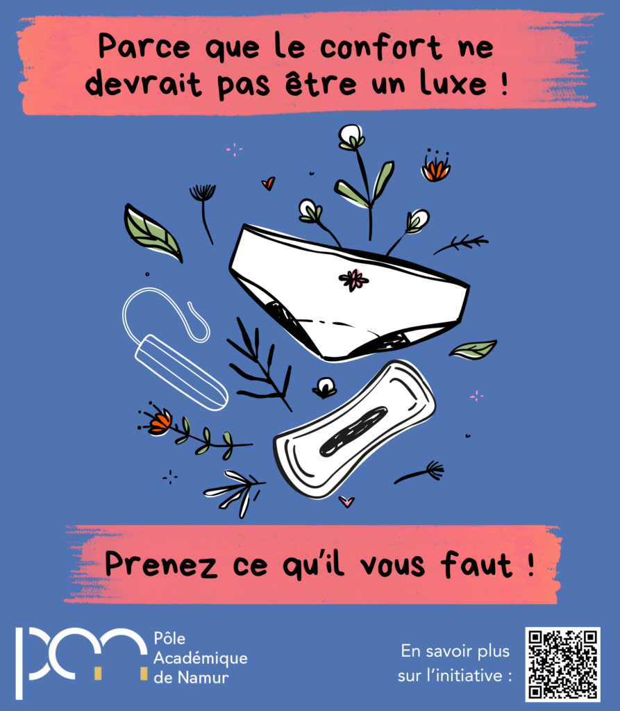 Un projet de lutte contre la précarité menstruelle a été porté par la Commission Vie Étudiante en collaboration avec 6 établissements membres du PAN (UNamur, Agro Bio-Tech, HEPN, HEAJ, IPFS et CESNa).