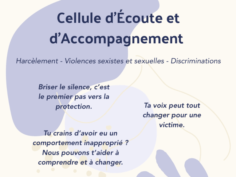 La cellule d’écoute et d’accompagnement offre un espace neutre, bienveillant et sécurisé à destination des étudiants des établissements d’enseignement supérieur du Namurois, qu’ils soient victimes, témoins ou auteurs de situations de harcèlement, de violences sexistes et sexuelles, ou de discriminations.