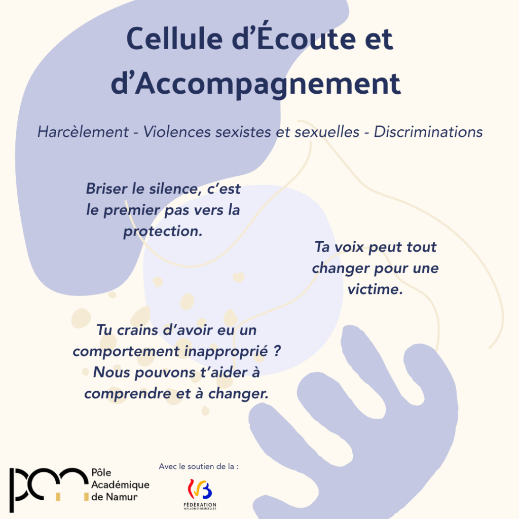 La cellule d’écoute et d’accompagnement offre un espace neutre, bienveillant et sécurisé à destination des étudiants des établissements d’enseignement supérieur de Namur, qu’ils soient victimes, témoins ou auteurs de situations de harcèlement, de violences sexistes et sexuelles, ou de discriminations.