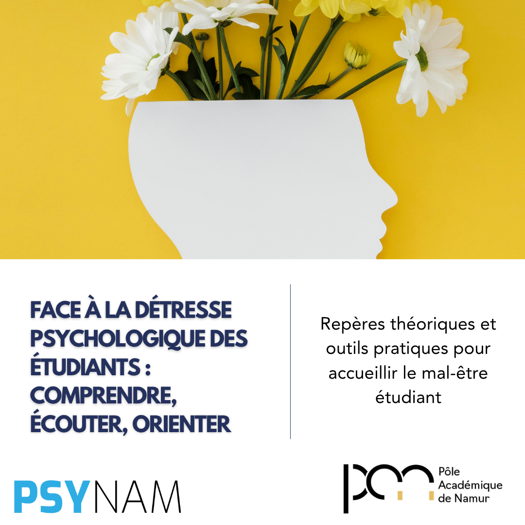 Dans le cadre des actions menées par la Commission Vie Etudiante en faveur du bien-être étudiant, le Pôle académique, en collaboration avec PsyNam, propose une demi-journée consacrée à l’accueil des étudiants vivant une situation de détresse psychologique : Face à la détresse psychologique des étudiants : comprendre, écouter, orienter.