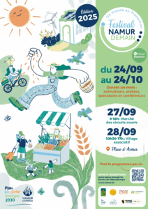 En collaboration avec la Ville de Namur, Le NID, la Ceinture Alimentaire et Energétique Namuroise, Emissions Zéro, Canopea, la Maison de l’Alimentation Durable et Arsenic2, le Festival Namur Demain vous invite à un mois d’événements pour repenser ensemble notre avenir dans une ambiance chaleureuse, conviviale et pleine d’énergie ! Il y en aura pour tous les goûts sur des sujets liés à la transition : énergie, mobilité, biodiversité, climat, … Cette année, l’alimentation sera particulièrement mise à l’honneur, avec un « Focus Nourrir » qui aura comme fil conducteur « Une alimentation durable accessible à tous et toutes ».
